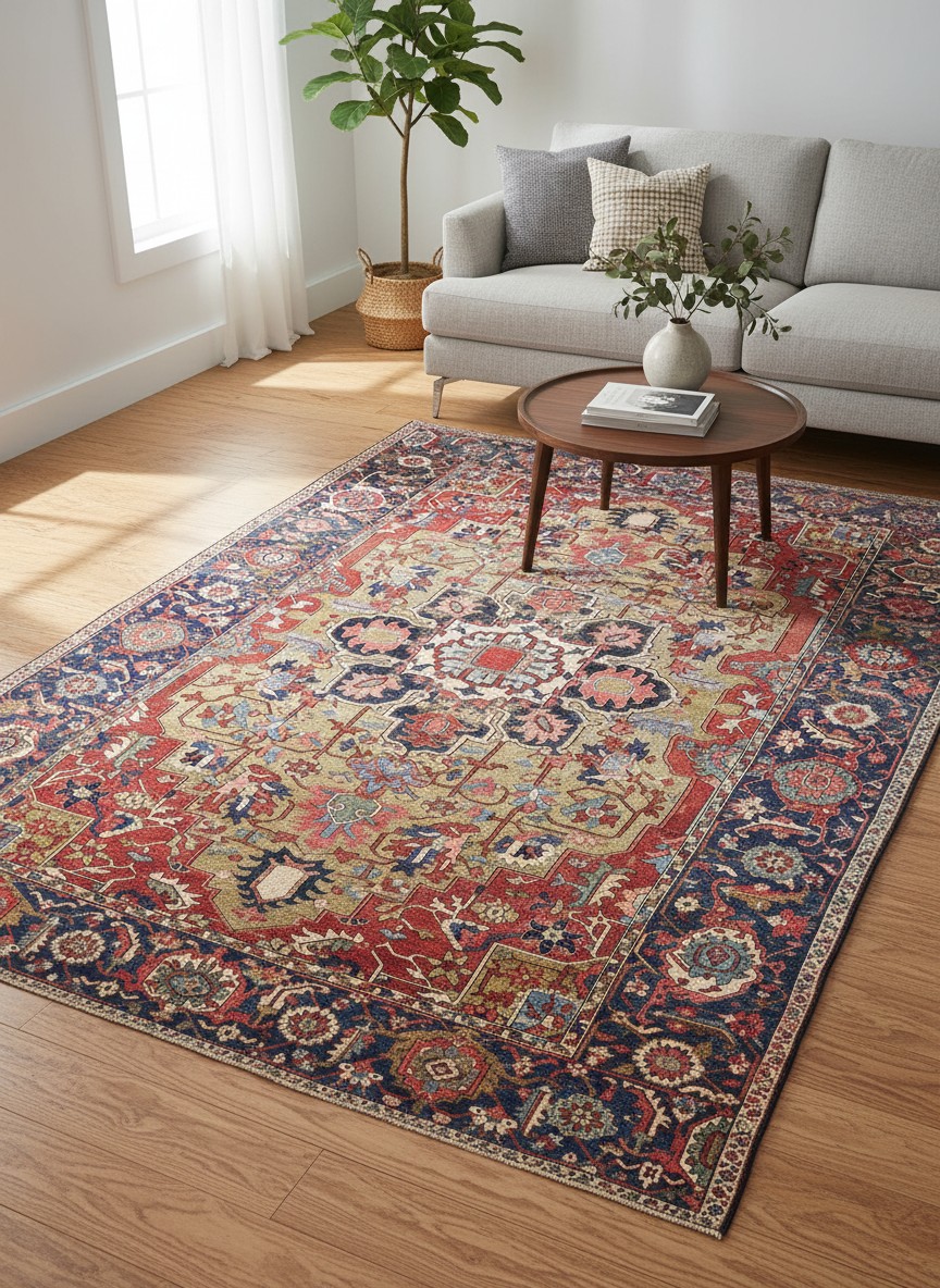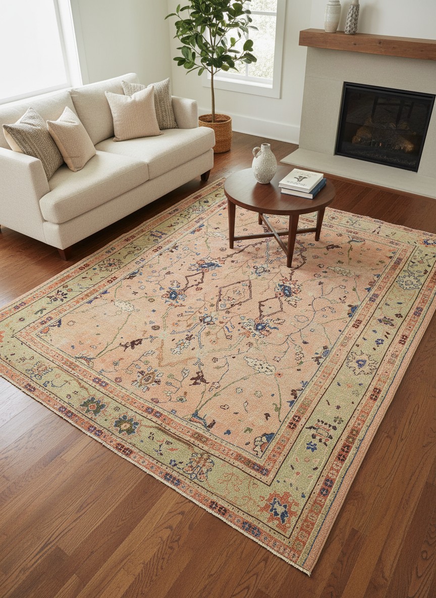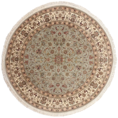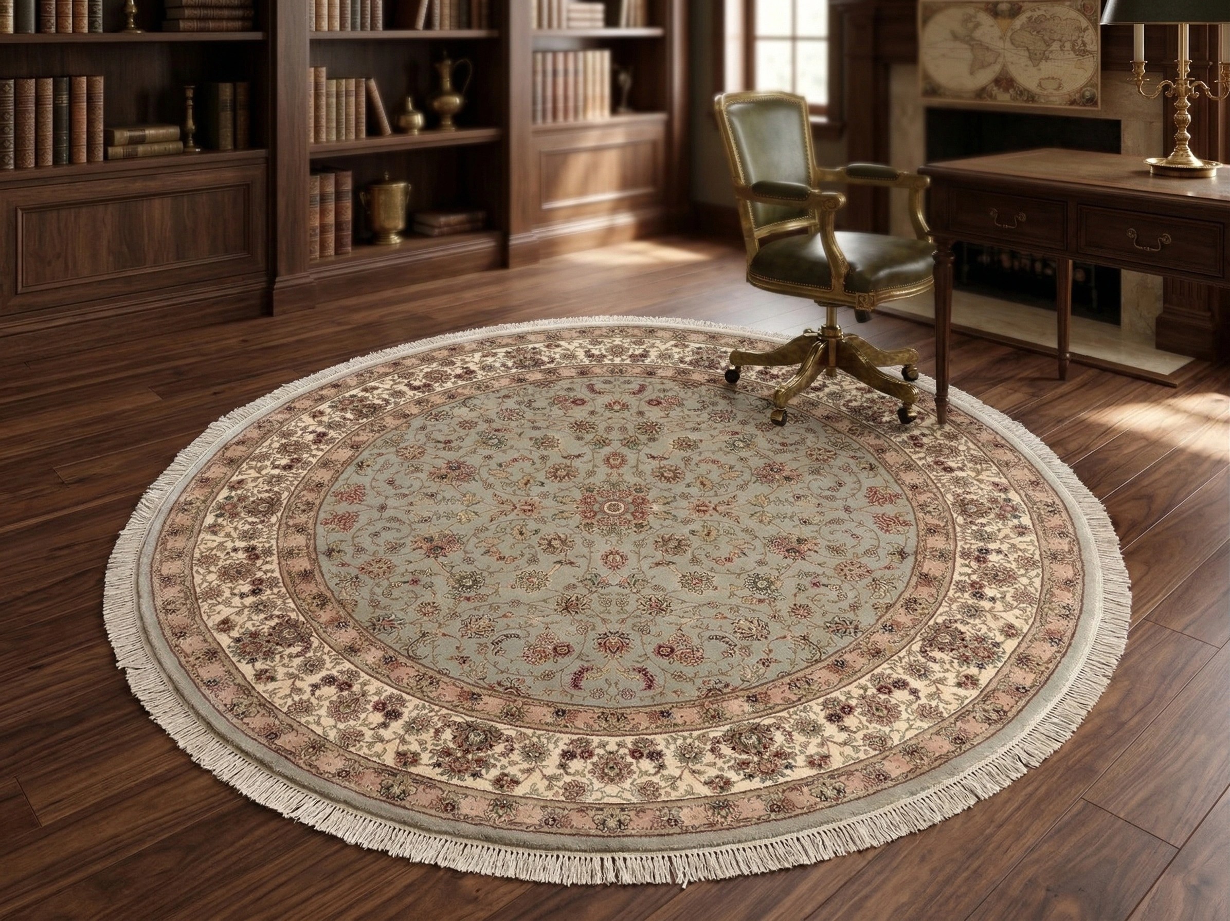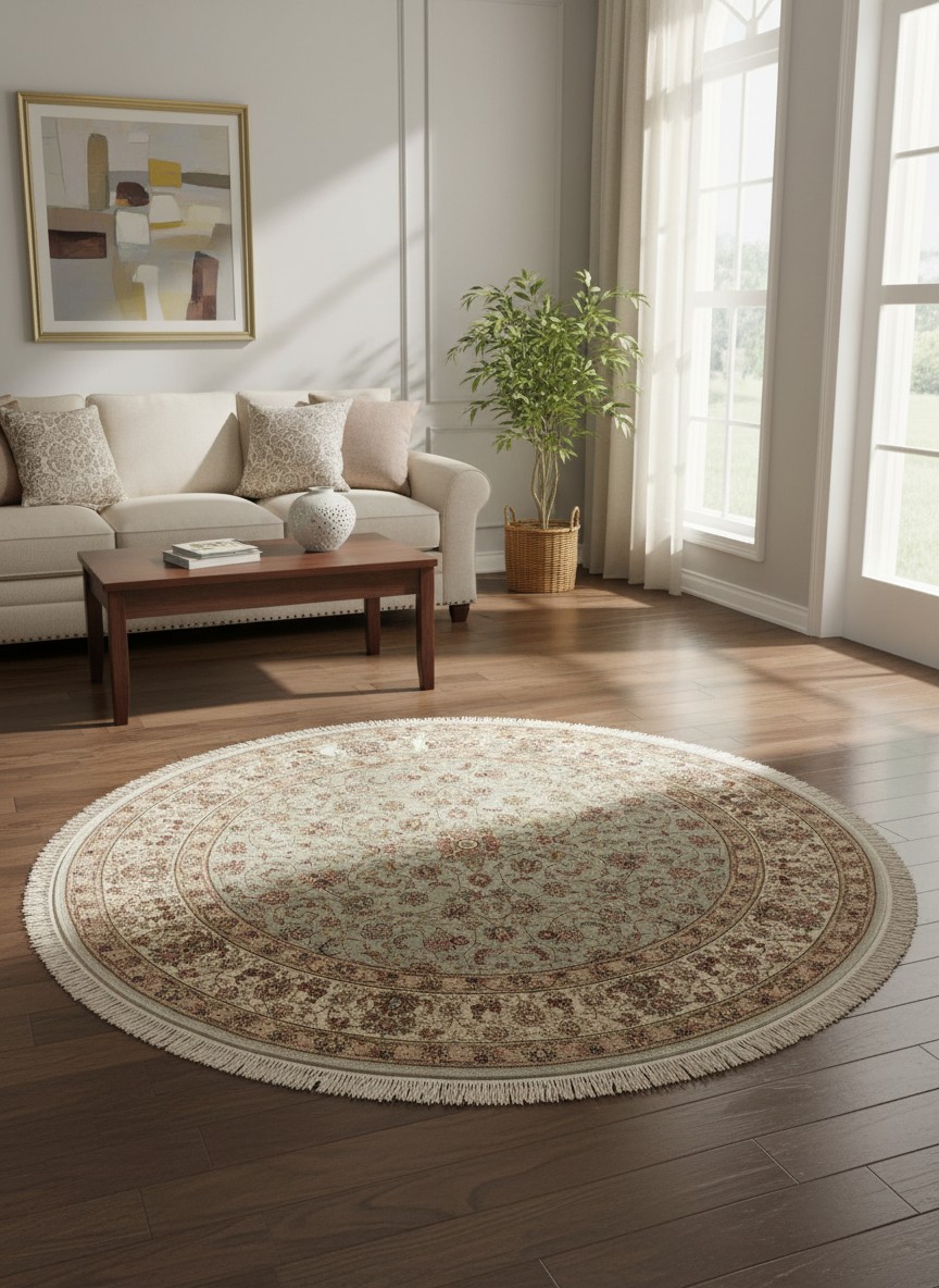 This elegant round rug features a traditional Chinese-inspired design with intricate floral patterns and a refined central medallion. The soft, muted color palette blends beautifully with both classic and modern interiors, creating a calm and sophisticated atmosphere. Finished with delicate fringe, it adds a timeless decorative touch while providing a comfortable surface for everyday use.